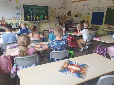Nach der feierlichen Einschulung wurden die Kinder von ihrer Klassenlehrerin in den neuen Klassenraum geführt. Dort konnten sie ihren eigenen Platz entdecken und sich umschauen. Die Lehrerin zeigte den Kindern den Klassenraum und erklärte, wo wichtige Dinge wie die Garderobe, die Tafel und die Leseecke zu finden sind. Anschließend lernten die Kinder die Fibel-Maskottchen Mimi und Momo kennen. Mimi und Momo werden die Klasse durch das Schuljahr begleiten und bei verschiedenen Aktivitäten helfen.